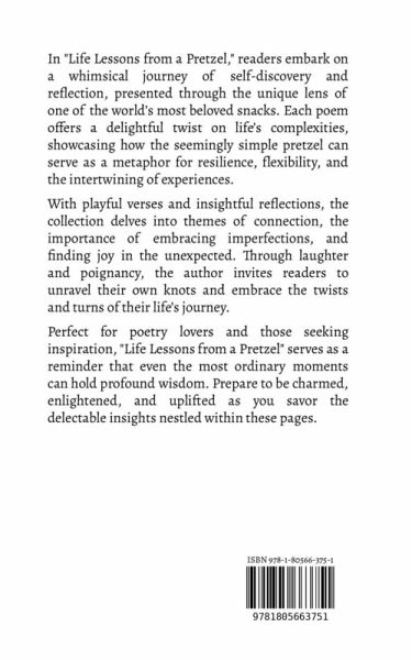 In "Life Lessons from a Pretzel," readers embark on a whimsical journey of self-discovery and reflection, presented through the unique lens of one of the world's most beloved snacks. Each poem offers a delightful twist on life's complexities, showcasing how the seemingly simple pretzel can serve as a metaphor for resilience, flexibility, and the intertwining of experiences. With playful verses and insightful reflections, the collection delves into themes of connection, the importance of embracing imperfections, and finding joy in the unexpected. Through laughter and poignancy, the author invites readers to unravel their own knots and embrace the twists and turns of their life's journey. Perfect for poetry lovers and those seeking inspiration, "Life Lessons from a Pretzel" serves as a reminder that even the most ordinary moments can hold profound wisdom. Prepare to be charmed, enlightened, and uplifted as you savor the delectable insights nestled within these pages.