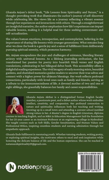 Ghazala Anjum's debut book, Life Lessons from Spirituality and Nature, is a thought-provoking work that illuminates the author's journey of self-discovery while celebrating life. She views life as a journey reflecting a vibrant essence through her experiences and interactions with others. Through a straightforward yet insightful narrative, the author emphasizes how life's experiences can impart valuable lessons, making it a helpful read for those seeking contentment and self-actualization. She values human emotions, introspection, and contemplation, believing in the importance of sharing life lessons with younger generations. What remains long after we close the book is a gentle joy and a sense of fulfillment from deliberately pursuing spiritual serenity, which promotes harmony. Ms. Anjum encapsulates the joys and challenges of existence, blending literary artistry with universal lessons. As a lifelong journaling enthusiast, she has transformed her passion for poetry into heartfelt Hindi verses and English translations, culminating in her bilingual debut book. This accessibility offers a delightful reading experience. The vivid imagery of early morning mists, beautiful gardens, and cherished memories guides readers to uncover their true selves and connect with a higher power for ultimate blessings. Her work reflects profound connections, particularly with loved ones such as family and friends, serving as a tribute to the interconnectedness of life. A devoted mother of two and one of eight siblings, she gracefully balances her family and career responsibilities.