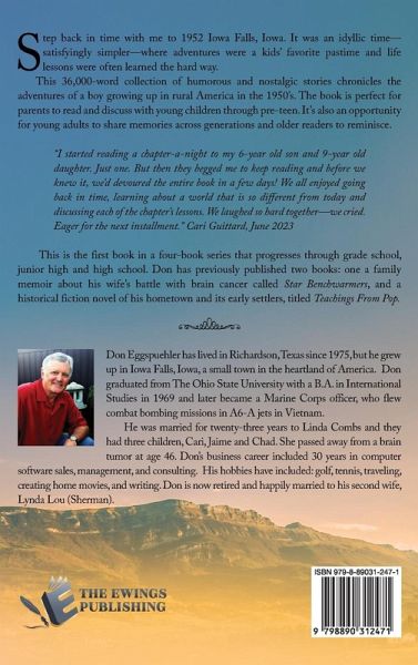 Step back in time with me to 1952 Iowa Falls, Iowa. It was an idyllic time--satisfying simpler--where adventures were a kid's favorite pastime and life lessons were often learned the hard way.This 36,000-word collection of humorous and nostalgic stories chronicles the shenanigans of a boy growing up in rural America in the 1950's. For older readers, this book will take you back to memories you probably haven't thought about in over 50 years. My objective was to trigger those long dormant memories in boomers who relate to this time period and could then pass their own stories down to their grandchildren. Or, they could even read my stories to their grandchildren to get the conversation started.This is the first of a four-book series that progresses through grade school, junior high and high school. Don has previously published two books: one a family memoir about his wife's battle with brain cancer, called Star Benchwarmers and a historical fiction novel of his hometown and its early settlers, titled Teachings From Pop.
