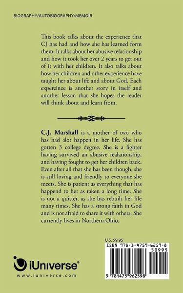 This book talks about the experience that CJ has had and how she has learned form them. It talks about her abusive relationship and how it took her over 2 years to get out of it with her children. It also talks about how her children and other experience have taught her about life and about God. Each expereince is another story in itself and another lesson that she hopes the reader will think about and learn from.