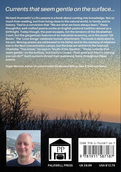 Richard Aronowitz’s Life Lessons is a book about coming into knowledge. Not so much from reading, but from living close to the natural world, to family and to history. Tied to a conviction that "We are what we have always been", these thoughtful, well-crafted poems evoke an English pastoral tradition almost as a birthright, except that today the poet escapes, not the tensions of the Elizabethan Court, but the gargantuan features of an industrial economy.