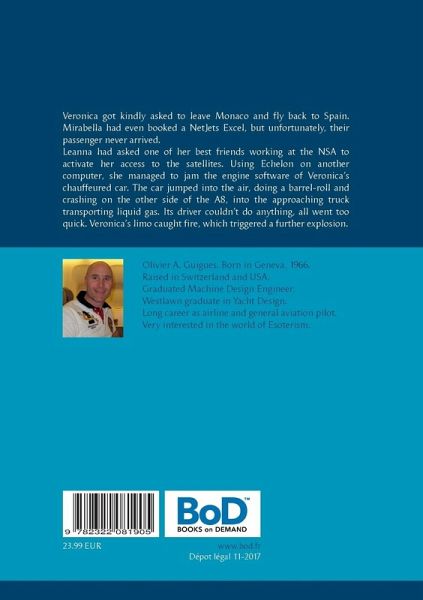 Mirabella had even booked a NetJets Excel, but unfortunately, their passenger never arrived. Leanna kindly asked one of her best friends working at the NSA to activate her access to the satellites. Using Echelon on another computer, she managed to jam the engine software on Veronica's chauffeured car. When the limo got closer to a truck in the opposite direction, she pushed the enter-key on her laptop. Within a second, the driver suffered a heart failure through an electrical discharge on the steering wheel; a wrong steering signal was sent to the servo-control as well as a brake jamming. The car jumped into the air, doing a barrel-roll and crashing on the other side of the A8, into the approaching truck transporting liquid gas.