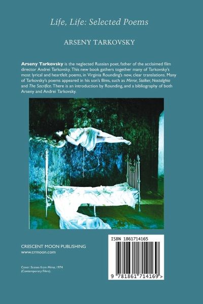 LIFE, LIFE BY ARSENY TARKOVSKY A book of poetry by Russian poet Arseny Tarkovsky, translated by Virginia Rounding. Includes many poems used in Arseny's son's films (Andrei Tarkovsky). With a bibliography of both Arseny and Andrei Tarkovsky, and illustrations from Tarkovsky's movies. FROM THE INTRODUCTION: Arseny Aleksandrovich Tarkovsky was was born in June 1907 in Elizavetgrad, later named Kirovograd. He studied at the Academy of Literature in Moscow from 1925 to 1929, and also worked in the editorial office of the journal Gudok. He was well respected as a translator, especially of the Oriental classics, but was little known as a poet for most of his life, being unable to get any of his own work published during the Stalinist era. His poems did not begin to appear in book form until he was over fifty. Illustrated. With bibliography and notes. ISBN 9781861714169. www.crmoon.com