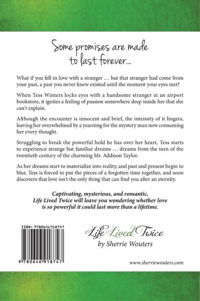 Life Lived Twice -By Sherrie Wouters Some promises are made to last forever ... What if you fell in love with a stranger ... but that stranger had come from your past, a past you never knew existed until the moment your eyes met? When Tess Winters locks eyes with a stranger at an airport bookstore, it ignites a feeling of passion somewhere deep inside her that she can't explain. Although the encounter is innocent and brief, the intensity of it lingers, leaving her overwhelmed by a yearning for the mystery man now consuming her every thought. Struggling to break the powerful hold he has over her heart, Tess starts to experience strange but familiar dreams...dreams from the turn of the twentieth century of the charming Mr Addison Taylor. As her dreams start to materialize into reality, and past and present begin to blur, Tess is forced to put the pieces of a forgotten time together, and soon discovers that love isn't the only thing that can find you after an eternity. Captivating, mysterious, and romantic, Life Lived Twice will leave you wondering whether love is so powerful it could last more than a lifetime.