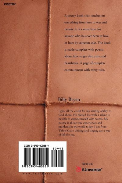 A poetry book that touches on everything from love to war and racism. It is a must have for anyone who has ever been in love or hurt by someone else. The book is made complete with poems about how to get thru pain and heartbreak. A page of complete entertainment with every turn.