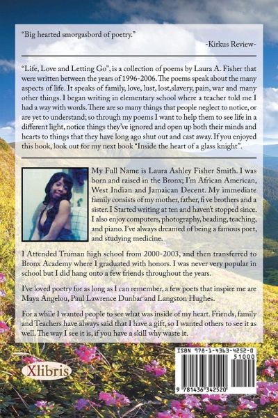 "Life, Love and Letting Go", is a collection of poems by Laura A. Fisher that were written between the years of 1996-2006. The poems speak about the many aspects of life. It speaks of family, love, lust, lost, slavery, pain, war and many other things. I began writing in elementary school where my 5th grade teacher Ms Quattlander told me I had a way with words. There are so many things that people neglect to notice, or are yet to understand; so through my poems I want to help them to see life in a different light. Notice things they've ignored and open up both their minds and hearts to things that they have long ago shut out and cast away. If you enjoyed this book, look out for my next book "Inside the heart of a glass knight".