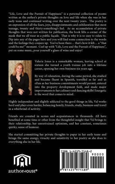 "Life, Love and the Pursuit of Happiness" is a personal collection of poems written as the author's private thoughts on love and life when she was in her early teens and continued writing over the next twenty years. The poetry is an expression of all the fears, joys, disappointments and exhilaration that most teenage, twenty and thirty-something's feel. As an accumulation of private thoughts that were not written for publication, the book lifts a corner of the mask that we all wear as a public façade. That is why it is so easy to relate to. Dip into any of the pages here and you will find some connection to the words and the feelings they conjure up. You've been there. that's how it felt. a "that could be me!" moment. Curl up with "Life, Love and the Pursuit of Happiness", put on some music, pour yourself a glass of wine and enjoy!