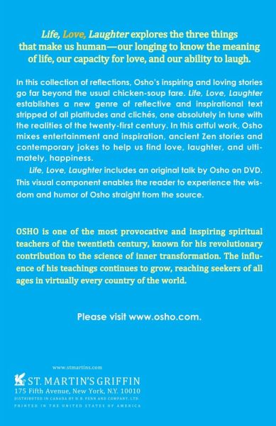 In Life, Love, Laughter: Celebrating Your Existence, one of the twentieth century's greatest spiritual teachers shares how humor and wisdom strengthens our lives. In this collection of reflections, Osho's encouraging and loving stories go far beyond the usual chicken-soup fare. Life, Love, Laughter establishes a new genre of introspective text stripped of all platitudes and clichés, and absolutely in tune with the realities of the twenty-first century. In this artful work, Osho mixes entertainment and inspiration, ancient Zen stories and contemporary jokes to help us to find love, laughter, and ultimately, happiness. Featuring an original talk by Osho on DVD, you'll experience his direct insight and wit straight from the source. Osho challenges readers to examine and break free of the conditioned belief systems and prejudices that limit their capacity to enjoy life in all its richness. He has been described by the Sunday Times of London as one of the "1000 Makers of the 20th Century" and by Sunday Mid-Day (India) as one of the ten people-along with Gandhi, Nehru, and Buddha-who have changed the destiny of India. Since his death in 1990, the influence of his teachings continues to expand, reaching seekers of all ages in virtually every country of the world.