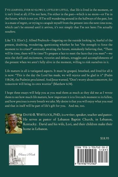 "One thing about him, when he was there, he was all there." I was listening to Dr. Gibson Winter, then Professor for Christianity and Society at Princeton Theological Seminary. Dr. Winter had this wonderful way of sharing an aside--an "oh by the way" story--which would invariably have a meaning all to itself, staying in my mind long after the words of the lecture had been snuffed out by the stuffy air of Stuart Hall. On this particular occasion, he was describing a colleague, whose name I've forgotten. The man, the subject of Dr. Winter's anecdote, was notorious for getting so immersed in his work that he would on occasion be a tad late for a faculty meeting or even his own lecture. He was the proverbial absent-minded professor: almost at times comical, yet respected and beloved. Upon arriving, he would light up the room, engaging others in lively conversation, making it easy for them to overlook his occasional tardiness. Then Dr. Winter capsulated his description of his colleague in that one phrase: "When he was there, he was all there." I could visualize this man; indeed, I felt as though I already knew him. You know him or her, too. These rare individuals are all there when they are there. They are the ones you wait on at the theater, or save a seat for at the restaurant, or strain your neck for as you anxiously anticipate their arrival at the ball game. "Where could he be?" you ask. "Do you think she remembered the address?" you wonder. "Did he get so immersed in his research that he forgot our engagement?" you question. And you want this person to be there. I could see Dr. Winter's friend arriving with disheveled hair, wearing in his tweed coat, wrinkled shirt, and blue jeans. He opens his arms wide to embrace his friends, apologizes for being late, and smiles as he asks how they are. And he means it. And suddenly everyone's little measure of agitation evaporates as they grin in return. He's there now, all there. Wherever this person is, he lives that moment to the fullest. And like moths attracted to light, people naturally drift in his direction. I've often wanted to be more like that man, whoever he was. Unfortunately, I haven't always been all there, once I was there. Too often I've been distracted by the place I had come from or the people I would see next. I've brought the problems of the past into the present or pre-played the worries of the future into the now. And in short, I wasn't there. I've learned, ever so slowly, little by little, that life is lived in the moment, or it isn't lived at all; if I'm not here, I'm either in the past--which is no more--or I'm in the future, which is not yet. If I'm still wandering around in the hallways of the past, lost in a maze of regret, or trying to catapult myself from the present into the next time zone, which can't be entered until it arrives, it's not simply that I'm not here: I'm actually nowhere. Like T.S. Eliot's J. Alfred Prufrock--lingering on the outside looking in, fearful of the present, doubting, wondering, questioning whether he has "the strength to force the moment to its crises?" anxiously awaiting the future, mistakenly believing that, "There will be time, there will be time/To prepare a face to meet the faces that you meet"--we miss the thrill and excitement, victories and defeats, struggles and accomplishments of the present when we aren't fully alive in the moment, willing to risk ourselves in it.