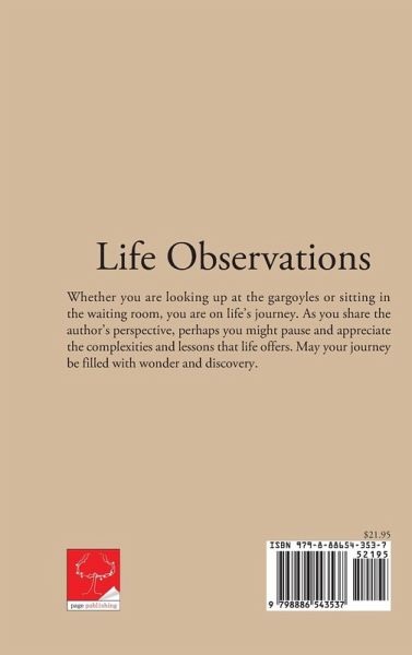 Whether you are looking up at the gargoyles or sitting in the waiting room, you are on life's journey. As you share the author's perspective, perhaps you might pause and appreciate the complexities and lessons that life offers. May your journey be filled with wonder and discovery.