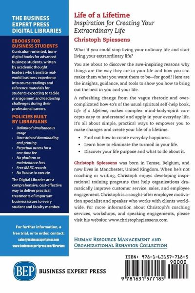 What if you could stop living your ordinary life and start living your extraordinary life? You are about to discover the awe-inspiring reasons why things are the way they are in your life and how you can make them what you want them to be-for good! Here are the insights, guidance, and tools to show you how to bring out the best in you and your life. A refreshing change from the vague rhetoric and over-complicated how-to's of the usual spiritual self-help book, Life of a Lifetime, makes complex mind-body-spirit concepts easy to understand and apply in your everyday life. It's all about simple, practical ways to empower you to make changes and create your life of a lifetime.