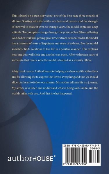 This is based on a true story about one of the best page three models of all time. Starting with the battles of adults and parents and the struggle of survival to make it even to teenage years, the model expresses deep solitude. To a complete change through the power of her Bible and letting God do her work and getting great reviews from national media, the model has a contrast of tears of happiness and tears of sadness. But the model somehow finds solutions to live life in a positive manner. This explains how one door will close and another can open. After vvthirteen years of success in that career, now the model is trained as a security officer. A big thank-you to AuthorHouse for helping me share my life with others and for allowing me to express that love is everything and that we should allow our heart to follow our dreams. My mother tells me life is a journey. My advice is to listen and understand what is being said. Smile, and the world smiles with you. And that is what happened.
