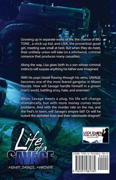 Growing up in separate walks of life, the chance of BIG TONE , a stick-up kid, and LISA, the proverbial good girl, meeting was small at best. But when they do meet, their unlikely union will take on a whirlwind, criminal romance that produces many casualties. Along the way, Lisa gives birth to a son whose criminal instincts will surpass anything his father ever imagined. With his pops blood flowing through his veins, SAVAGE becomes one of the most feared gangstas in Miami Florida. How will Savage handle himself in a grown man's world, battling envy, hate, and enemies? When Savage meets a plug, his life will change dramatically, but with more money comes more problems. And with the murder rate on the rise, and the Fed's in town, will Savage's empire fall? Or will he outwit the alphabet boys and their nationwide dragnet?
