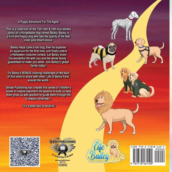A Puppy Adventure For The Ages! This is a collection of the 13th 14th & 15th true stories about an unforgettable dog named Bailey. Bailey is a kind and happy dog who has the quality of life that most pets dream about. Bailey helps calm a lost dog, then he explores an aquarium for the first time, and finally enters a Halloween costume contest. Let Bailey share his wonderful life with you and the whole family - guaranteed to make you smile. Join Bailey's global family today! Try Bailey's BONUS coloring challenges at the back of this book to share with other 'Life of Bailey Fans' around the world. Sensei Publishing has created this series of children's books to inspire important life lessons in kids, to help them grow up with wisdom to guide them through life to always remember... - It's a great day to be alive!