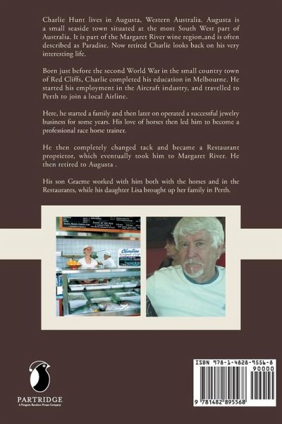 Charlie Hunt lives in Augusta, WesternAustralia. Augusta is a small seaside town situated at the most South West part of Australia. It is part of the Margaret River wine region,and is often described as Paradise. Now retired Charlie looks back on his very interesting life. Born just before the second World War in the small country town of Red Cliffs,Charlie completed his education in Melbourne. He started his employment in the Aircraft industry,and travelled to Perth to join a local Airline. Here he started a family,and then later on operated a successful jewelry business for some years. His love of horses then led him to become a professional race horse trainer. He then completely changed tack and became a Restaurant proprietor,which eventually took him to Margaret River. He then retired to Augusta . His son Graeme worked with him both with the horses and in the Restaurants,while his daughter Lisa brought up her family in Perth.
