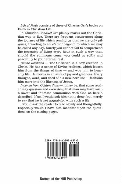 Life of Faith consists of three of Charles Orr's books on Faith in Christian Life. In Christian Conduct Orr plainly marks out the Christian way to live. There are frequent occurrences along the journey of life which remind us that we are only pilgrims, traveling to an eternal beyond, to which we may be called any day. Surely you cannot fail to comprehend the necessity of living every hour in such a way that, should the summons come, you could go softly and peacefully to your eternal rest. Divine Realities - The Christian is a new creation in Christ. He has a sense of Divine realities, which loosen him from the things of time - and woo him to heavenly life. He moves in an aura of joy and gladness. Every thought, word, and deed of his new-born life - fashions him more into the likeness of Jesus. Incense from Golden Vials - It may be, that some reader may question and even deny that man may have such a sweet and intimate communion with God as herein described. If so, I would ask him not to deny, but merely to say that he is not acquainted with such a life. I would ask the reader to read slowly and thoughtfully. Especially would I have him meditate upon the quotations on the closing pages.
