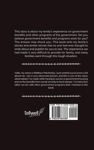 This story is about my family's experience on government benefits and other programs of the government. Do you believe government benefits and programs work for you? The answer may shock you. This book tells my family's stories and similar stories that no one had ever thought to write about and publish for you to see. The experience we had made it very difficult to provide for family, and many families went through this tough situation.