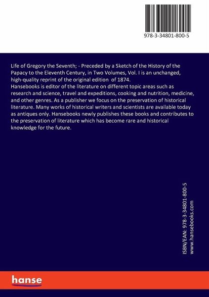 Life of Gregory the Seventh; - Preceded by a Sketch of the History of the Papacy to the Eleventh Century, in Two Volumes, Vol. I is an unchanged, high-quality reprint of the original edition of 1874.Hansebooks is editor of the literature on different topic areas such as research and science, travel and expeditions, cooking and nutrition, medicine, and other genres. As a publisher we focus on the preservation of historical literature. Many works of historical writers and scientists are available today as antiques only. Hansebooks newly publishes these books and contributes to the preservation of literature which has become rare and historical knowledge for the future.