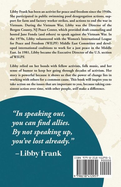 This is a book about the life of Libby Frank and her story of chasing peace and justice with humor, guts, and passion. Libby Frank was an activist for peace and freedom since the 1940s. She participated in public swimming pool desegregation actions, support for farm and factory worker strikes, and actions to end the war in Vietnam. During the Vietnam War, Libby was the Director of the Bergen County, NJ Peace Center, which provided draft counseling and hosted Jane Fonda (and others) to speak against the Vietnam War. In the 1970s, Libby volunteered with the Women's International League for Peace and Freedom (WILPF) Middle East Committee and developed international coalitions to work for a just peace in the Middle East. In 1981, Libby became the Executive Director of the U.S. section of WILPF. Libby relied on her bonds with fellow activists, folk music, and her sense of humor to keep her going through decades of activism. Her story shows us that the power of change lies in working with others for a common cause.