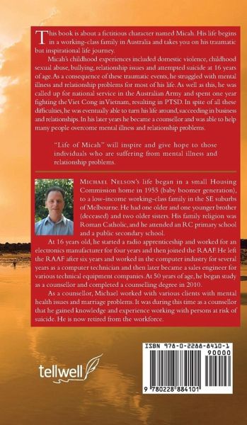 This book is about a fictitious character named Micah. His life begins in a working-class family in Australia and takes you on his traumatic but inspirational life journey. Micah's childhood experiences included domestic violence, childhood sexual abuse, bullying, relationship issues and attempted suicide at 16 years of age. As a consequence of these traumatic events, he struggled with mental illness and relationship problems for most of his life. As well as this, he was called up for national service in the Australian Army and spent one year fighting the Viet Cong in Vietnam, resulting in PTSD. In spite of all these difficulties, he was eventually able to turn his life around, succeeding in business and relationships. In his later years he became a counsellor and was able to help many people overcome mental illness and relationship problems. "Life of Micah" will inspire and give hope to those individuals who are suffering from mental illness and relationship problems.