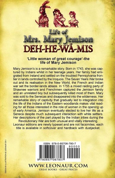'Little woman of great courage'-the life of Mary Jemison Mary Jemison's is a remarkable story. Born in 1743, she was captured by Indians whilst in her teenage years. Her family had emigrated from Ireland and settled on the troubled Pennsylvania frontier in lands controlled by the Iroquois. The Seven Years War broke out and its realisation in the New World, the French and Indian war set the border-lands ablaze. In 1755 a mixed raiding party of Shawnee warriors and Frenchmen captured the Jemison family and an unrelated boy but subsequently killed most of them. Mary was sold to the Senecas and disappeared into the wilderness. Her remarkable story of captivity that gradually led to integration into the life of the Indians of the Eastern woodlands makes vital reading for all those interested in the role of women in the opening up of early America. Jemison eventually elected to live her life as a Seneca despite much subsequent interaction with white settlers. Her descriptions of the part played by the Indian tribes during the Revolutionary War are both unusual and vitally interesting. Leonaur editions are newly typeset and are not facsimiles; each title is available in softcover and hardback with dustjacket.