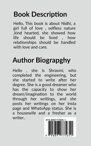 Hello, This book is about Nidhi, a girl full of love, selfless nature, kind hearted, she showsed how life should be lived, how relationships should be handled with love and care.
