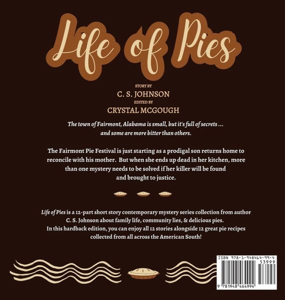 The town of Fairmont, Alabama is small, but it's full of secrets ... and some are more bitter than others. The Fairmont Pie Festival is just starting as a prodigal son returns home to reconcile with his mother. But when she ends up dead in her kitchen, more than one mystery needs to be solved if her killer will be found and brought to justice. Life of Pies is a 12-part short story contemporary mystery series collection from author C. S. Johnson about family life, community lies, & delicious pies. In this hardback edition, you can enjoy all 12 stories along with 12 great pie recipes collected from all across the American South!