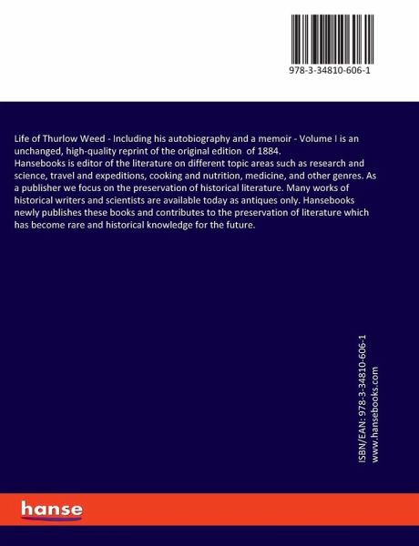 Life of Thurlow Weed - Including his autobiography and a memoir - Volume I is an unchanged, high-quality reprint of the original edition of 1884.Hansebooks is editor of the literature on different topic areas such as research and science, travel and expeditions, cooking and nutrition, medicine, and other genres. As a publisher we focus on the preservation of historical literature. Many works of historical writers and scientists are available today as antiques only. Hansebooks newly publishes these books and contributes to the preservation of literature which has become rare and historical knowledge for the future.
