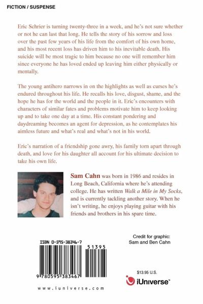 Eric Schrier is turning twenty-three in a week, and he's not sure whether or not he can last that long. He tells the story of his sorrow and loss over the past few years of his life from the comfort of his own home, and his most recent loss has driven him to his inevitable death. His suicide will be most tragic to him because no one will remember him since everyone he has loved ended up leaving him either physically or mentally. The young antihero narrows in on the highlights as well as curses he's endured throughout his life. He recalls his love, disgust, shame, and the hope he has for the world and the people in it. Eric's encounters with characters of similar fates and problems motivate him to keep looking up and to take one day at a time. His constant pondering and daydreaming becomes an agent for depression, as he contemplates his aimless future and what's real and what's not in his world. Eric's narration of a friendship gone awry, his family torn apart through death, and love for his daughter all account for his ultimate decision to take his own life.