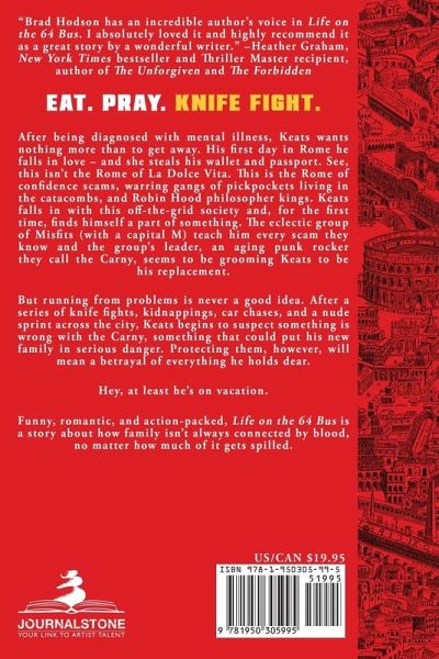 After being diagnosed with mental illness, Keats wants nothing more than to get away. His first day in Rome he falls in love - and she steals his wallet and passport. See, this isn't the Rome of La Dolce Vita. This is the Rome of confidence scams, warring gangs of pickpockets living in the catacombs, and Robin Hood philosopher kings. Keats falls in with this off-the-grid society and, for the first time, finds himself a part of something. The eclectic group of Misfits (with a capital M) teach him every scam they know and the group's leader, an aging punk rocker they call the Carny, seems to be grooming Keats to be his replacement. But running from problems is never a good idea. After a series of knife fights, kidnappings, car chases, and a nude sprint across the city, Keats begins to suspect something is wrong with the Carny, something that could put his new family in serious danger. Protecting them, however, will mean a betrayal of everything he holds dear. Hey, at least he's on vacation. Funny, romantic, and action-packed, Life on the 64 Bus is a story about how family isn't always connected by blood, no matter how much of it gets spilled.