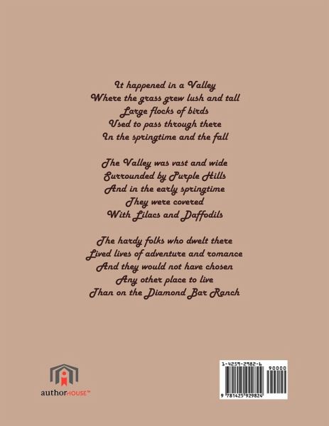 It happened in a Valley Where the grass grew lush and tall Large flocks of birds Used to pass through there In the springtime and the fall The Valley was vast and wide Surrounded by Purple Hills And in the early springtime They were covered With Lilacs and Daffodils The hardy folds who dwelt there Lived lives of adventure and romance And they would not have chosen Any other place to live Than on the Diamond Bar Ranch