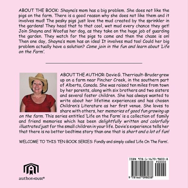 Shayna's mom has a big problem. She does not like the pigs on the farm. There is a good reason why she does not like them and it involves mud! The pesky pigs just love the mud created by the sprinkler in the gardens! They head that to that cool, wet mud every chance they get! Join Shayna and Woofus, her dog, as they take on the huge job of guarding the garden. They watch for the pigs to come and then the chase is on! Then one day, Shayna's mom has an idea! It involves mud too! Could her big problem actually have a solution? Come join in the fun and learn about 'Life on the Farm'.
