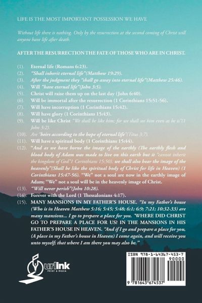 LIFE IS THE MOST IMPORTANT POSSESSION WE HAVE Without life there is nothing. Only by the resurrection at the second coming of Christ will anyone have life after death. AFTER THE RESURRECTION THE FATE OF THOSE WHO ARE IN CHRIST. (1). Eternal life (Romans 6:23). (2). "Shall inherit eternal life"(Matthew 19:29). (3). After the judgment they "shall go away into eternal life"(Matthew 25:46). (4). Will "have eternal life"(John 3:5). (5). Christ will raise them up on the last day (John 6:40). (6). Will be immortal after the resurrection (1 Corinthians 15:51-56). (7). Will have incorruption (1 Corinthians 15:42). (8). Will have glory (1 Corinthians 15:43). (9). Will be like Christ "We shall be like him; for we shall see him even as he is"(1 John 3:2). (10). Are "heirs according to the hope of eternal life"(Titus 3:7). (11). Will have a spiritual body (1 Corinthians 15:44). (12). "And as we have borne the image of the earthly (The earthly flesh and blood body of Adam was made to live on this earth but it "cannot inherit the kingdom of God"1 Corinthians 15:50), we shall also bear the image of the heavenly"(Shall be like the spiritual body of Christ for life in Heaven) (1 Corinthians 15:47-56). "We" not a soul are now in the earthly image of Adam; "We" not a soul will be in the heavenly image of Christ. (13). "Will never perish"(John 10:28). (14). Forever with the Lord (1 Thessalonians 4:17). (15). MANY MANSIONS IN MY FATHER'S HOUSE. "In my Father's house (Who is in Heaven Matthew 5:16; 5:45; 5:48; 6:1; 6:9; 7:21; 10:32-33) are many mansions... I go to prepare a place for you. "WHERE DID CHRIST GO TO PREPARE A PLACE FOR US? IN THE MANSIONS IN HIS FATHER'S HOUSE IN HEAVEN. "And if I go and prepare a place for you, (A place in my Father's house in Heaven) I come again, and will receive you unto myself; that where I am there you may also be."