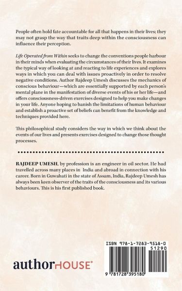 People often hold fate accountable for all that happens in their lives; they may not grasp the way that traits deep within the consciousness can influence their perception. Life Operated from Within seeks to change the conventions people harbour in their minds when evaluating the circumstances of their lives. It examines the typical way of looking at and reacting to life experiences and explores ways in which you can deal with issues proactively in order to resolve negative conditions. Author Rajdeep Umesh discusses the mechanics of conscious behaviour-which are essentially supported by each person's mental plane in the manifestation of diverse events of his or her life-and offers consciousness-driven exercises designed to help you make changes in your life. Anyone hoping to banish the limitations of human behaviour and establish a proactive set of beliefs can benefit from the knowledge and techniques provided here. This philosophical study considers the way in which we think about the events of our lives and presents exercises designed to change those thought processes.