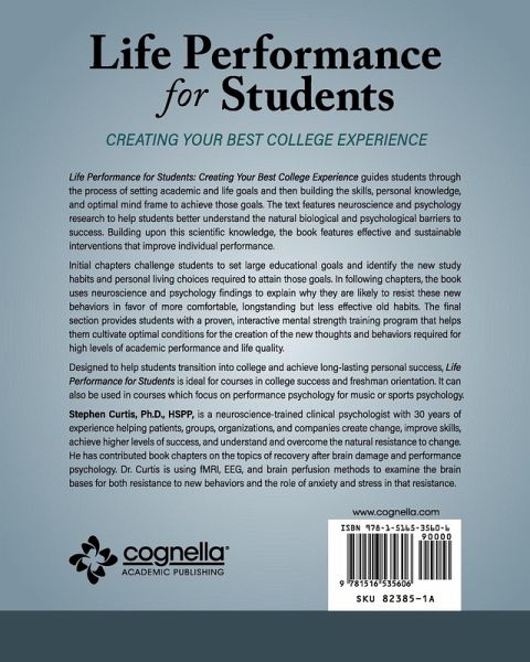 Life Performance for Students: Creating Your Best College Experience guides students through the process of setting academic and life goals and then building the skills, personal knowledge, and optimal mind frame to achieve those goals. The text features neuroscience and psychology research to help students better understand the natural biological and psychological barriers to success. Building upon this scientific knowledge, the book features effective and sustainable interventions that improve individual performance. Initial chapters challenge students to set large educational goals and identify the new study habits and personal living choices required to attain those goals. In following chapters, the book uses neuroscience and psychology findings to explain why they are likely to resist these new behaviors in favor of more comfortable, longstanding but less effective old habits. The final section provides students with a proven, interactive mental strength training program that helps them cultivate optimal conditions for the creation of the new thoughts and behaviors required for high levels of academic performance and life quality. Designed to help students transition into college and achieve long-lasting personal success, Life Performance for Students is ideal for courses in college success and freshman orientation. It can also be used in courses which focus on performance psychology for music or sports psychology. Stephen Curtis, Ph.D., HSPP, is a neuroscience-trained clinical psychologist with 30 years of experience helping patients, groups, organizations, and companies create change, improve skills, achieve higher levels of success, and understand and overcome the natural resistance to change. He has contributed book chapters on the topics of recovery after brain damage and performance psychology. Dr. Curtis is using fMRI, EEG, and brain perfusion methods to examine the brain bases for both resistance to new behaviors and the role of anxiety and stress in that resistance.