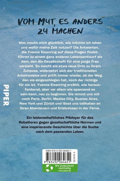 Was macht mich glücklich, wie möchte ich leben und wofür meine Zeit nutzen? Die Antworten, die Yvonne Eisenring auf diese Fragen findet, führen zu einem ganz anderen Lebensentwurf als dem, den die Gesellschaft für eine junge Frau vorsieht. So macht sie etwa neue Orte zu ihrem Zuhause, widersetzt sich der traditionellen Arbeitsweise und prüft immer wieder, ob der Weg, den sie eingeschlagen hat, noch der richtige für sie ist. Yvonne Eisenring erzählt, wie herausfordernd, aber vor allem wie spannend es sein kann, neu zu beginnen. Sie nimmt uns mit nach Paris, Berlin, Mexico City, Buenos Aires, New York und Zürich und lässt uns teilhaben an ihren Abenteuern und Erlebnissen in der Ferne.