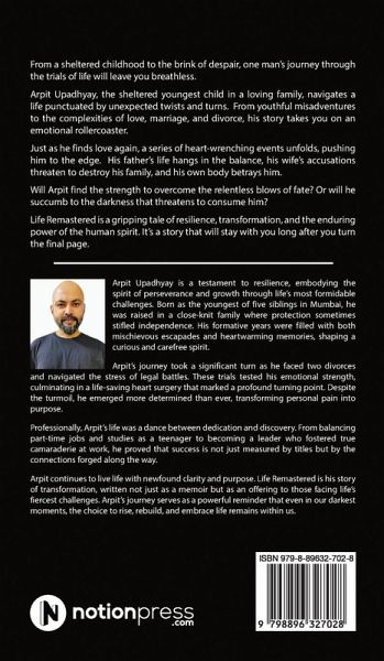 From a sheltered childhood to the brink of despair, one man's journey through the trials of life will leave you breathless. Arpit Upadhyay, the sheltered youngest child in a loving family, navigates a life punctuated by unexpected twists and turns. From youthful misadventures to the complexities of love, marriage, and divorce, his story takes you on an emotional rollercoaster. Just as he finds love again, a series of heart-wrenching events unfolds, pushing him to the edge. His father's life hangs in the balance, his wife's accusations threaten to destroy his family, and his own body betrays him. Will Arpit find the strength to overcome the relentless blows of fate? Or will he succumb to the darkness that threatens to consume him? Life Remastered is a gripping tale of resilience, transformation, and the enduring power of the human spirit. It's a story that will stay with you long after you turn the final page.