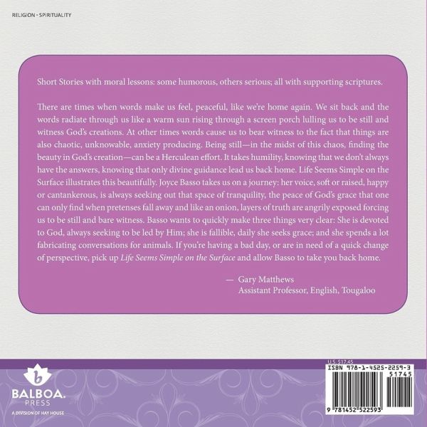 Short Stories with moral lessons: some humorous, others serious; all with supporting scriptures. There are times when words make us feel, peaceful, like we're home again. We sit back and the words radiate through us like a warm sun rising through a screen porch lulling us to be still and witness God's creations. At other times words cause us to bear witness to the fact that things are also chaotic, unknowable, anxiety producing. Being still-in the midst of this chaos, finding the beauty in God's creation-can be a Herculean effort. It takes humility, knowing that we don't always have the answers, knowing that only divine guidance lead us back home. Life Seems Simple on the Surface illustrates this beautifully. Joyce Basso takes us on a journey: her voice, soft or raised, happy or cantankerous, is always seeking out that space of tranquility, the peace of God's grace that one can only find when pretenses fall away and like an onion, layers of truth are angrily exposed forcing us to be still and bare witness. Basso wants to quickly make three things very clear: She is devoted to God, always seeking to be led by Him; she is fallible, daily she seeks grace; and she spends a lot fabricating conversations for animals. If you're having a bad day, or are in need of a quick change of perspective, pick up Life Seems Simple on the Surface and allow Basso to take you back home. - Gary Matthews Assistant Professor, English, Tougaloo