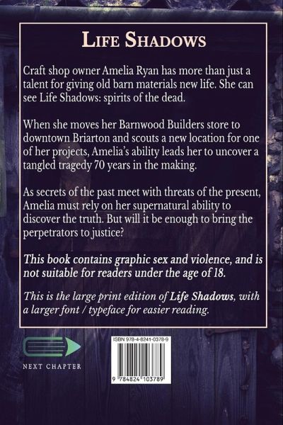 This book contains graphic sex and violence, and is not suitable for readers under the age of 18. Craft shop owner Amelia Ryan has more than just a talent for giving old barn materials new life. She can see Life Shadows: spirits of the dead. When she moves her Barnwood Builders store to downtown Briarton and scouts a new location for one of her projects, Amelia's ability leads her to uncover a tangled tragedy 70 years in the making. As secrets of the past meet with threats of the present, Amelia must rely on her supernatural ability to discover the truth. But will it be enough to bring the perpetrators to justice? This is the large print edition of Life Shadows, with a larger font / typeface for easier reading.