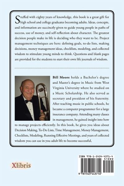 Stuffed with eighty years of knowledge, this book is a great gift for high school and college graduates becoming adults. Ideas, concepts, and information are succinctly given to guide young people in paths of success, use of money, and self-reflection about character. The greatest decision people make in life is deciding who they want to be. Project management techniques are here: defining goals, to-do lists, making decisions, money management ideas, checklists, modeling, and collected wisdom to stimulate young minds to think. Questions and blank pages are provided for the students to start their own life journals of wisdom.