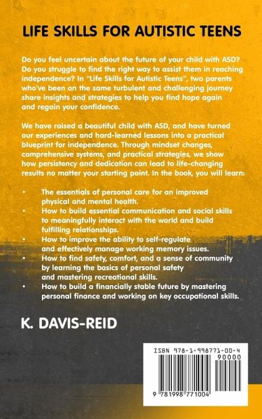 Do you feel uncertain about the future of your child with ASD? Do you struggle to find the right way to assist them in reaching independence? In "Life Skills for Autistic Teens," two parents who've been on the same turbulent and challenging journey share insights and strategies to help you find hope again and regain your confidence. We have raised a beautiful child with ASD, and have turned our experiences and hard-learned lessons into a practical blueprint for independence. Through mindset changes, comprehensive systems, and practical strategies, we show how persistency and dedication can lead to life-changing results no matter your starting point. In the book, you will learn: ¿ The essentials of personal care for improved physical and mental health. ¿ How to build essential communication and social skills to meaningfully interact with the world and build fulfilling relationships. ¿ How to improve the ability to self-regulate and effectively manage working memory issues. ¿ How to find safety, comfort, and a sense of community by learning the basics of personal safety and mastering recreational skills. ¿ How to build a financially stable future by mastering personal finance and working on key occupational skills. And much more. If you want to learn strategies to help your child be independent and live a happy and fulfilling life then scroll up and click the "Buy Now" button.