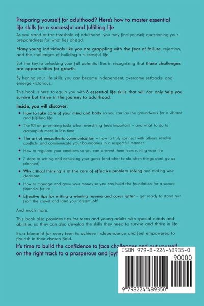 9 FREE BONUS ACTIVITIES WITH YOUR PURCHASE Preparing yourself for adulthood? Here's how to master essential life skills for a successful and fulfilling life Are you feeling overwhelmed by the uncertainties of the future and wondering if you have what it takes to achieve your goals? Do you lack the confidence and life skills needed to become independent and navigate adulthood successfully? Have you ever hesitated to take on new opportunities or pursue your dreams because you fear failure? The world might seem like a vast and complicated puzzle, and you may find yourself questioning your preparedness for what lies ahead. But remember this: The journey to adulthood is not a solitary one. Gaining the skills and self-assurance to stride confidently into the future is a concern for every teenager. You have the power to transform uncertainty into curiosity and doubt into clarity. The good news is that this book is here to equip you with 8 essential life skills that will not only help you survive but thrive in the journey to adulthood. In this guide, here is just a fraction of what you will discover:How to take care of your mind and body so you can lay the groundwork for a vibrant and fulfilling life The 101 on prioritizing tasks when everything feels important - and what to do to accomplish more in less time The art of empathetic communication - how to truly connect with others, resolve conflicts, and communicate your boundaries in a respectful manner How to regulate your emotions so you can prevent them from ruining your life 7 steps to setting and achieving your goals (and what to do when things don't go as planned) Why critical thinking is at the core of effective problem-solving and making wise decisions (and how you can hone this ability while having fun) How to manage and grow your money so you can build the foundation for a secure financial future Effective tips for writing a winning resume and cover letter - get ready to stand out from the crowd and land your dream job! And much more. This book also provides tips for teens and young adults with special needs and abilities on how to develop the skills they need to survive and thrive in life. It's a blueprint for every teen to achieve independence and feel empowered to flourish in their chosen field. So, what are you waiting for? This is your path if you aim to become independent and pave the way for a successful adulthood.