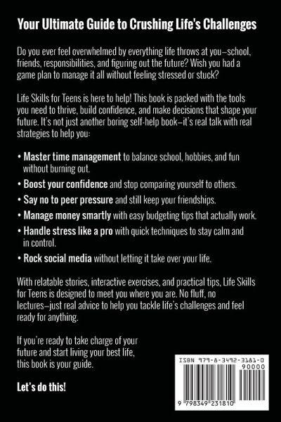 Your Ultimate Guide to Crushing Life's Challenges Do you ever feel overwhelmed by everything life throws at you-school, friends, responsibilities, and figuring out the future? Wish you had a game plan to manage it all without feeling stressed or stuck? Life Skills for Teens is here to help! This book is packed with the tools you need to thrive, build confidence, and make decisions that shape your future. It's not just another boring self-help book-it's real talk with real strategies to help you:Master time management to balance school, hobbies, and fun without burning out. Boost your confidence and stop comparing yourself to others. Say no to peer pressure and still keep your friendships. Manage money smartly with easy budgeting tips that actually work. Handle stress like a pro with quick techniques to stay calm and in control. Rock social media without letting it take over your life. With relatable stories, interactive exercises, and practical tips, Life Skills for Teens is designed to meet you where you are. No fluff, no lectures-just real advice to help you tackle life's challenges and feel ready for anything. If you're ready to take charge of your future and start living your best life, this book is your guide. Let's do this!