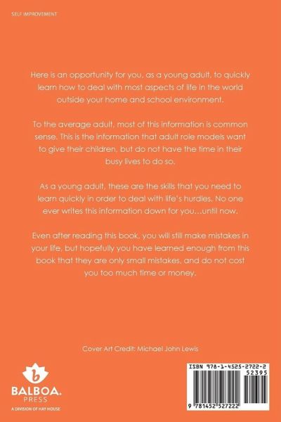 Here is an opportunity for you, as a young adult to quickly learn how to deal with most aspects of life in the world outside your home and school environment. To the average adult, most of this information is 'common sense' and this is the information that adult role models want to give their children, but do not have the time in their busy lives to do so. As a young adult, THESE are the skills that you need to learn quickly in order to deal with life's hurdles. No one ever writes this information down for you ...until now. Even AFTER reading this book you WILL still make mistakes in your life, but hopefully you have learned enough from this book that they are only small mistakes, and not cost you too much time or money.