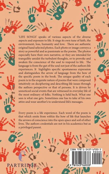'LIFE SONGS' speaks of various aspects of the diverse aspects and exposure to life. It sings its own tune of faith, the environment, loss, humanity and love. There are authentic original hand selected photos. Each photo or image conveys a story as powerful and as passionate as the poems. The photos especially have their own narrative, or they are intended for tranquility amidst the turbulent thoughts, or to provoke and awaken the conscience of the soul to respond to life. The language is from the gut of the soul not just of the authors life experiences. It highlights specific spontaneous expression and distinguishes the arrow of language from the bow of the specific poem in the book. The unique quality of each poem is in the exquisite nature of poems that were composed intuitively on deciphering and describing life issues through the authors perspective or that of persons. It is driven by unnoticed social events that are witnessed in everyday life of the most ordinary of folks. Nothing is held back. What one sees is what one gets. Sometimes one has to take of his own attire and wear another's to understand life's messages.
