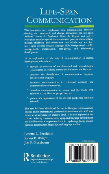 This innovative text emphasizes how communicative processes develop, are maintained, and change throughout the life span. Topics covered include language skills, interpersonal conflict management, socialization, care-giving, and relationship development.