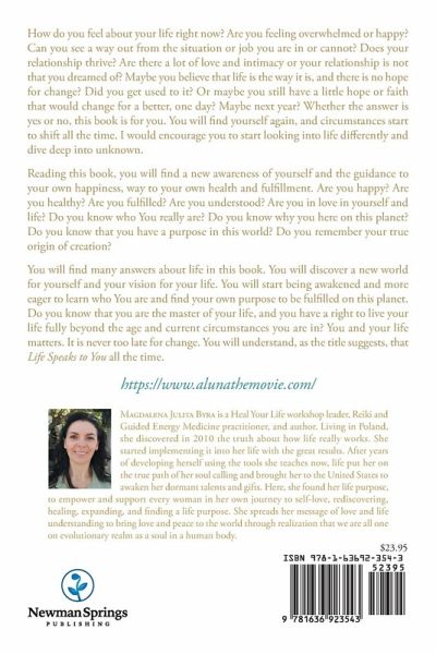 How do you feel about your life right now? Are you feeling overwhelmed or happy? Can you see a way out from the situation or job you are in or cannot? Does your relationship thrive? Are there a lot of love and intimacy or your relationship is not that you dreamed of? Maybe you believe that life is the way it is, and there is no hope for change? Did you get used to it? Or maybe you still have a little hope or faith that would change for a better, one day? Maybe next year? Whether the answer is yes or no, this book is for you. You will find yourself again, and circumstances start to shift all the time. I would encourage you to start looking into life differently and dive deep into unknown. Reading this book, you will find a new awareness of yourself and the guidance to your own happiness, way to your own health and fulfillment. Are you happy? Are you healthy? Are you fulfilled? Are you understood? Are you in love in yourself and life? Do you know who You really are? Do you know why you here on this planet? Do you know that you have a purpose in this world? Do you remember your true origin of creation? You will find many answers about life in this book. You will discover a new world for yourself and your vision for your life. You will start being awakened and more eager to learn who You are and find your own purpose to be fulfilled on this planet. Do you know that you are the master of your life, and you have a right to live your life fully beyond the age and current circumstances you are in? You and your life matters. It is never too late for change. You will understand, as the title suggests, that Life Speaks to You all the time. https://www.alunathemovie.com