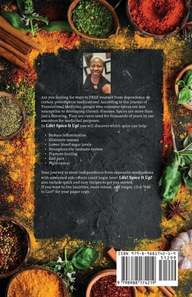 Are you looking for ways to FREE yourself from dependence on certain prescription medications? According to the Journal of Translational Medicine, people who consume spices are less susceptible to developing chronic diseases. Spices are more than just a flavoring. They are cures used for thousands of years by our ancestors for medicinal purposes. In Life! Spice It Up! you will discover which spice can help:Reduce inflammation Eliminate nausea Lower blood sugar levels Strengthen the immune system Promote healing End pain Fight cancer Your journey to more independence from expensive medications with unwanted side effects could begin here! Life! Spice It Up! also include quick and easy recipes to get you started.
