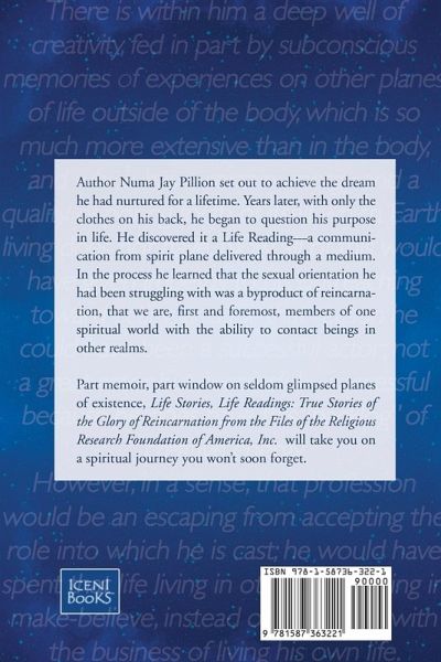 Author Numa Jay Pillion set out to achieve the dream he had nurtured for a lifetime. Years later, with only the clothes on his back, he began to question his purpose in life. He discovered it in a Life Reading -- a communication from spirit plane delivered through a medium. In the process he learned that the sexual orientation he had been struggling with was a byproduct of reincarnation, that we are, first and foremost, members of one spiritual world with the ability to contact beings in other realms. Part memoir, part window on seldom glimpsed planes of existence, Life Stories, Life Readings: True Stories of the Glory of Reincarnation from the Files of the Religious Research Foundation of America, Inc. will take you on a spiritual journey you won't soon forget.