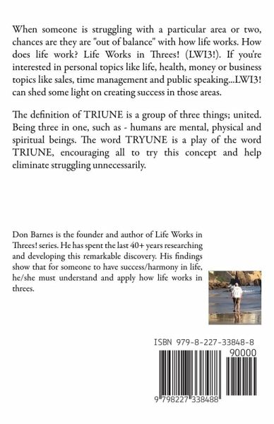 When someone is struggling with a particular area or two, chances are they are "out of balance" with how life works. How does life work? Life Works in Threes! (LWI3!). If you're interested in personal topics like life, health, money or business topics like sales, time management and public speaking...LWI3! can shed some light on creating success in those areas. The definition of TRIUNE is a group of three things; united. Being three in one, such as - humans are mental, physical and spiritual beings. The word TRYUNE is a play of the word TRIUNE, encouraging all to try this concept and help eliminate struggling unnecessarily. So when it comes to making life choices, it certainly helps to understand that life works in threes. Similar to a 3-ingredient recipe or combination lock. You need to know the three exact numbers to open a combination lock. Life is the same way. Apply the three parts that a particular thing consist of and you will be in balance/harmony with it.